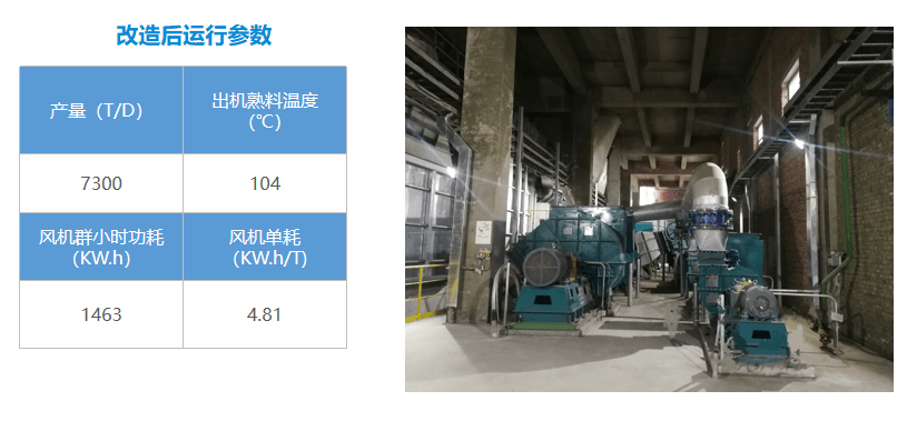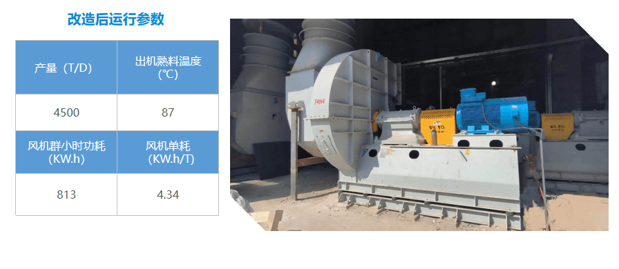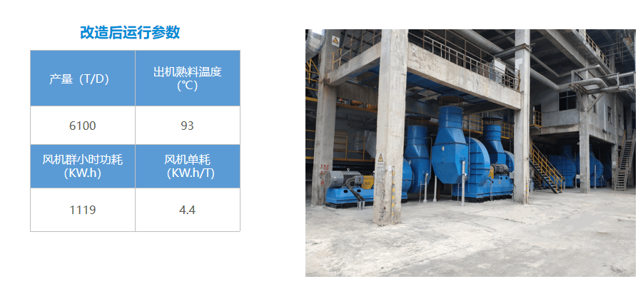 該企業(yè)裝備5條日產(chǎn)5000噸規(guī)模的熟料生產(chǎn)線,2022年推進(jìn)的C線篦冷機(jī)改造中廠家選用沃亞機(jī)械的高效篦冷機(jī)冷卻風(fēng)機(jī),投入運(yùn)行5個(gè)月時(shí)間,通過雙方技術(shù)標(biāo)定,本項(xiàng)目冷卻風(fēng)機(jī)運(yùn)行效率高(風(fēng)機(jī)群整體運(yùn)行效率>83.5%),冷卻電耗表現(xiàn)非常優(yōu)異,風(fēng)機(jī)效率優(yōu)勢明顯,達(dá)到同型號篦冷機(jī)冷卻風(fēng)機(jī)電耗優(yōu)秀水平。