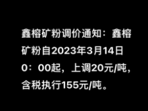 鑫榕礦粉調價通稱,自2023年3月14日0時起上調20元/噸,含稅執行155元/噸。