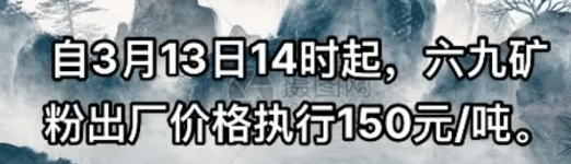 六九礦粉通知,自3月13日14時起出廠價格執行150元/噸。