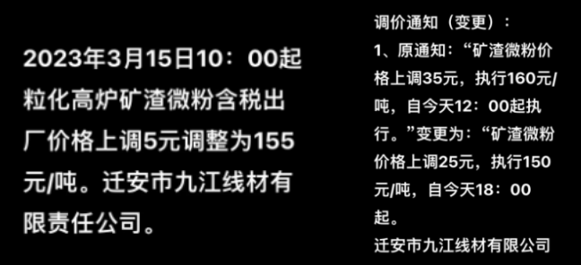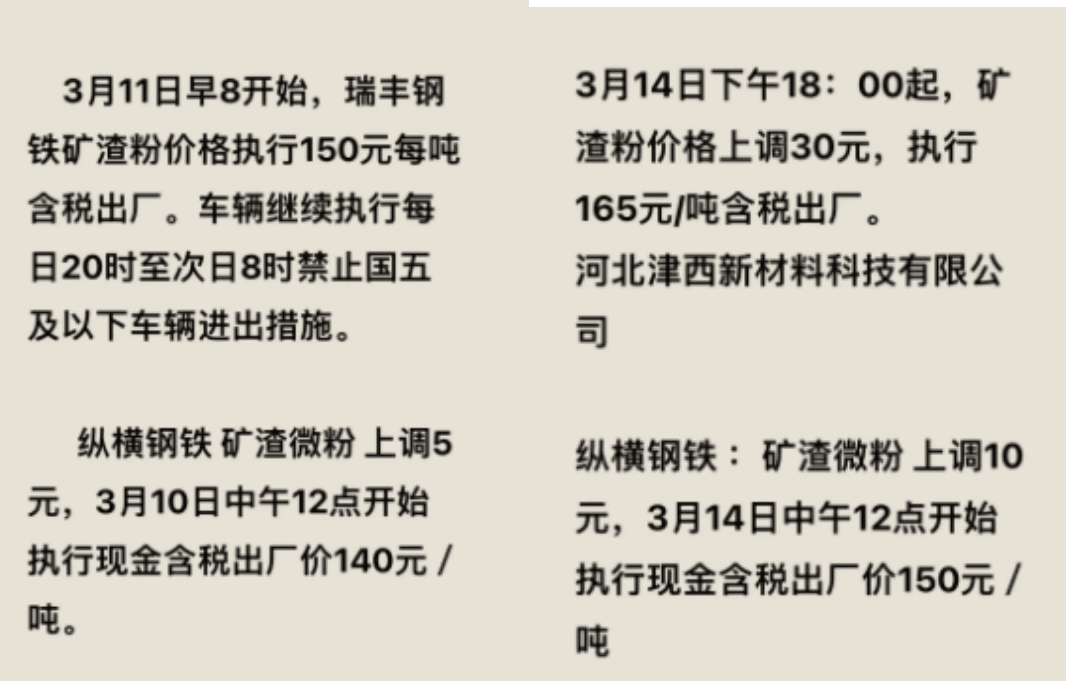 瑞豐鋼鐵通知3月11日早8開始,礦渣粉價格執行150元每噸含稅出廠。