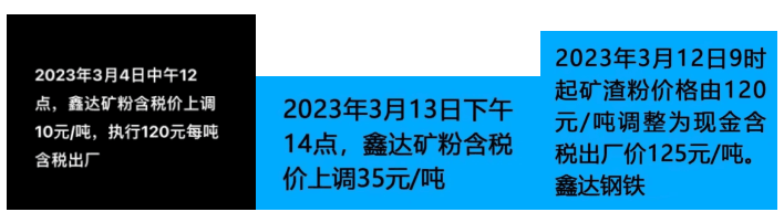 鑫達礦粉通知3月4日上調10元/噸;3月12日上調5元/噸;3月14日上調20元/噸,目前含稅執行155元/噸。