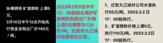 3月9日,山東日照礦渣粉價格上調10元/噸,一周內累計上調40元/噸