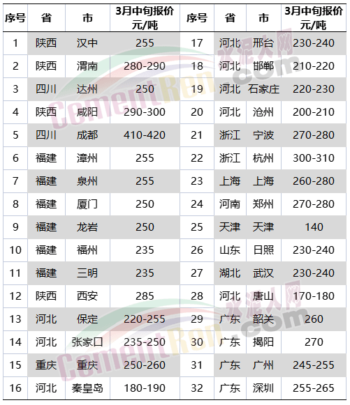 據市場反饋3月份以來多地礦渣粉價格出現回暖行情 :