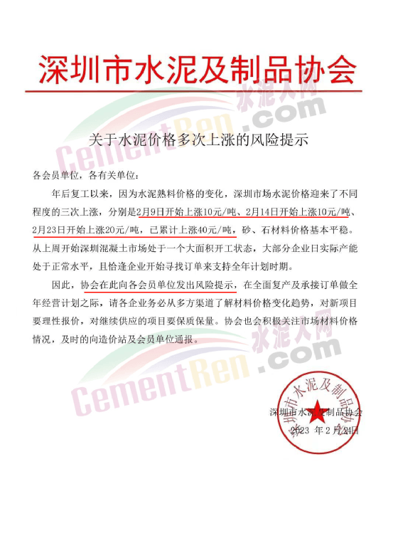 深圳市水泥及制品協會曾發風險提示函稱,自年后復工以來,因為水泥熟料價格的變化,深圳市場水泥價格迎來了不同程度的三次上漲,分別是2月9日開始上漲10元/噸、2月14日開始上漲10元/噸、2月23日開始上漲20元/噸,已累計上漲40元/噸,砂、石材料價格基本平穩,因此協會向各會員單位發出風險提示。