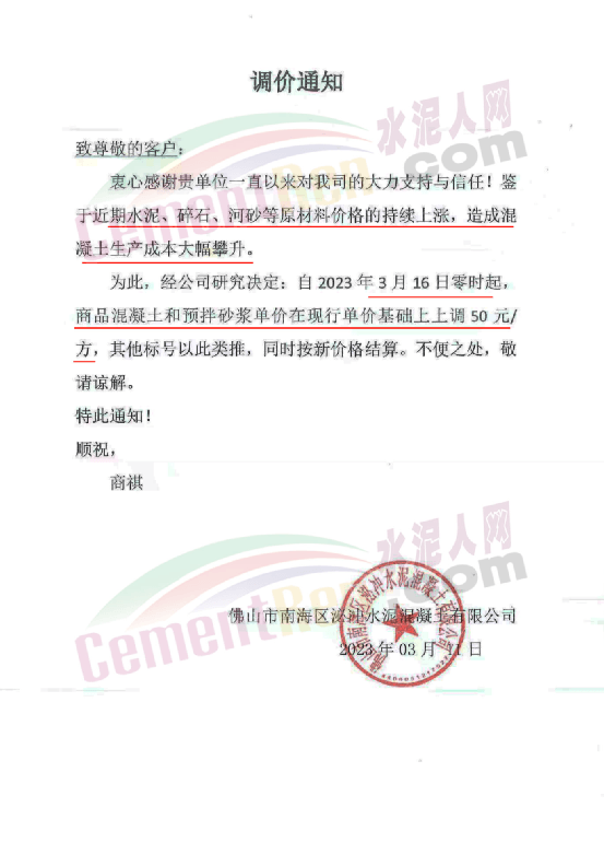 3月11日佛山市南海區泌沖水泥混凝土有限公司、佛山市南海建源混凝土有限公司發調價通知稱,鑒于近期水泥、碎石、河砂等原材料價格的持續上漲,造成混凝土生產成本大幅攀升。經公司研究決定:自2023年3月16日零時起商品混凝土和預拌砂漿單價在現行單價基礎上上調50元/方,其他標號以此類推,同時按新價格結算。