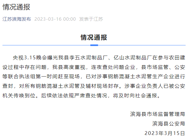 據(jù)“江蘇濱海發(fā)布”微信號(hào)16日0時(shí)消息,濱海縣市場(chǎng)監(jiān)督管理局、濱海縣公安局通報(bào)稱,央視“3.15”晚會(huì)曝光濱海縣李五水泥制品廠、億山水泥制品廠在參與農(nóng)田建設(shè)過程中存在問題,濱海縣高度重視,連夜查處問題企業(yè),縣市場(chǎng)監(jiān)管、公安等聯(lián)合執(zhí)法組第一時(shí)間趕至現(xiàn)場(chǎng),已對(duì)涉事鋼筋混凝土水泥管生產(chǎn)企業(yè)進(jìn)行查封,對(duì)所有鋼筋混凝土水泥管及輔材現(xiàn)場(chǎng)封存。涉事企業(yè)負(fù)責(zé)人已被公安機(jī)關(guān)傳喚到位。后續(xù)依法依規(guī)嚴(yán)肅查處情況,將及時(shí)向社會(huì)通報(bào)。