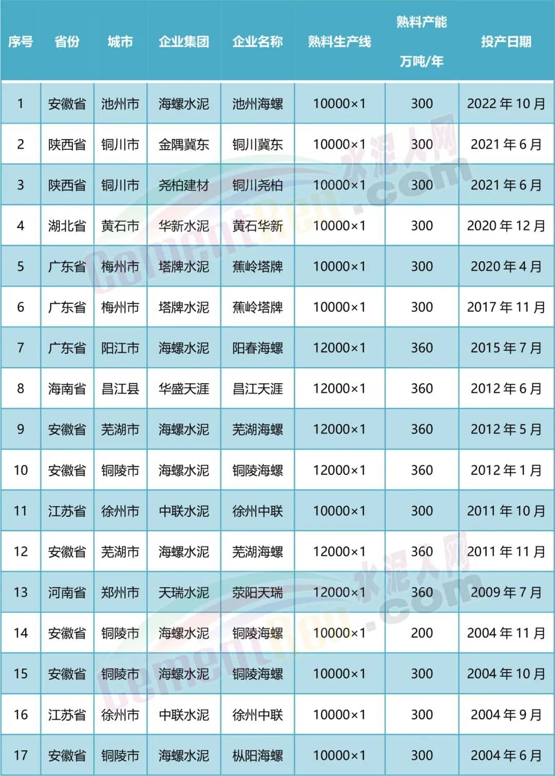 近來多個省市自治區(qū)公布截止2022年12月底的水泥熟料生產(chǎn)線清單,水泥人網(wǎng)注意到在安徽省公布的清單中,海螺水泥七條萬噸線尤其亮眼。