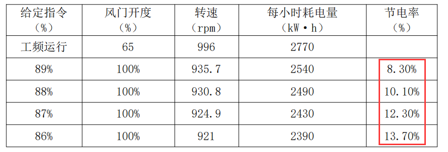 相較于工頻轉(zhuǎn)速,65%風門開度節(jié)電率約為13.7%。