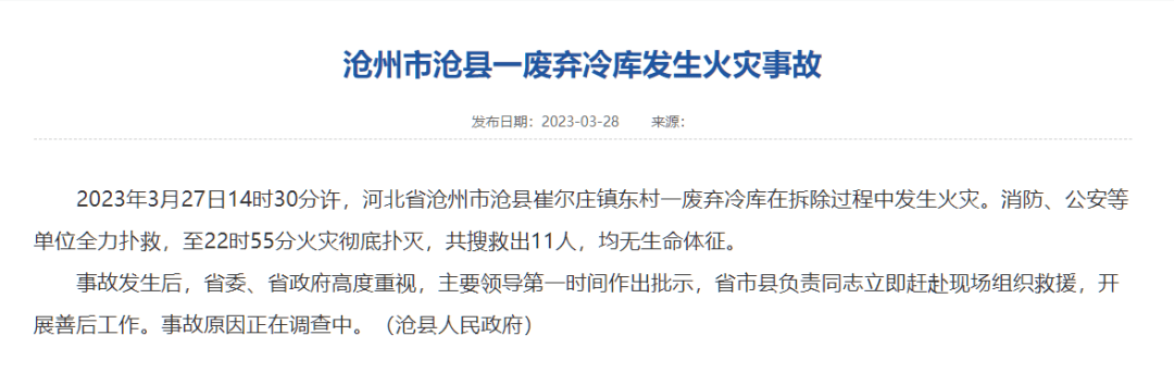 據河北省滄州市滄縣人民政府官網28日消息, 2023年3月27日14時30分許,河北省滄州市滄縣崔爾莊鎮東村一廢棄冷庫在拆除過程中發生火災。消防、公安等單位全力撲救,至22時55分火災徹底撲滅,共搜救出11人,均無生命體征。