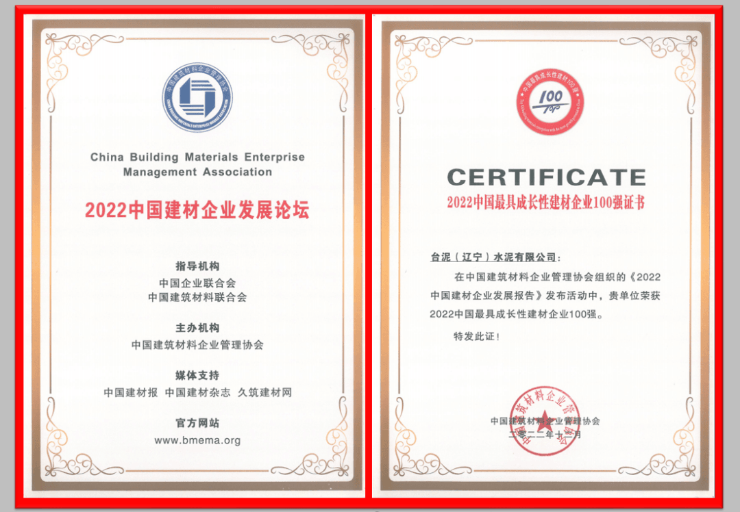 喜報丨臺泥遼寧廠榮獲“2022中國最具成長性建材企業100強”殊榮