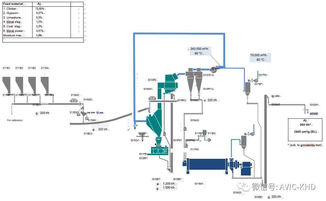 新建輥壓機閉路系統(布置在現有水泥車間外的臨近空地處):新購置主機設備包括輥壓機(KHD)、V型靜態選粉機(KHD)、高效動態選粉機(KHD)、高效低壓損旋風筒(KHD)、循環風機、袋收塵器及風機等。