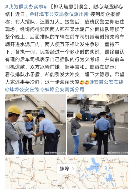 因兩人都在某水泥廠外面排隊等候了整個晚上,后面排隊的車輛在前車司機睡著時搶先將車輛開進水泥廠內,兩人便互不相讓發生爭吵,僵持不下,各執一詞。