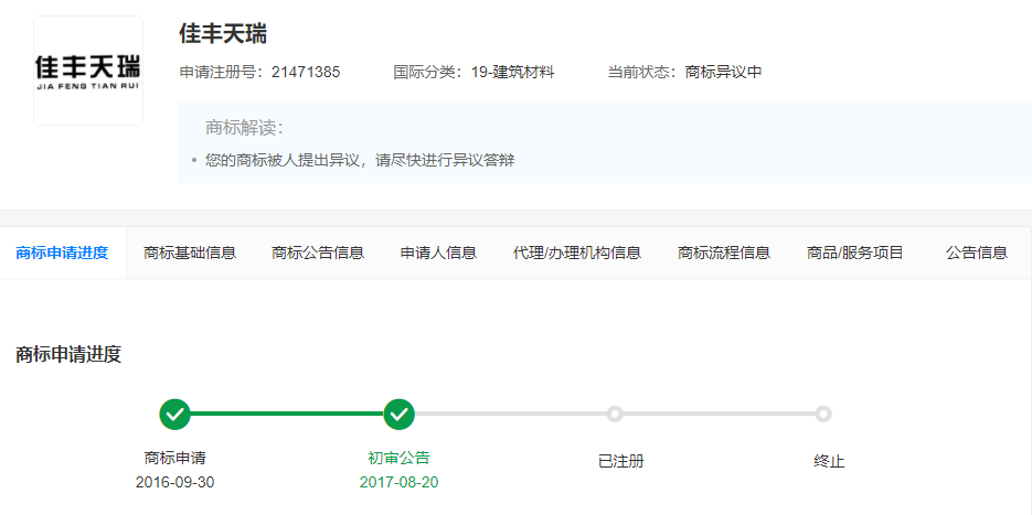 水泥人網注意到,上述水泥包裝袋上標稱的“佳豐天瑞”商標申請并未通過。