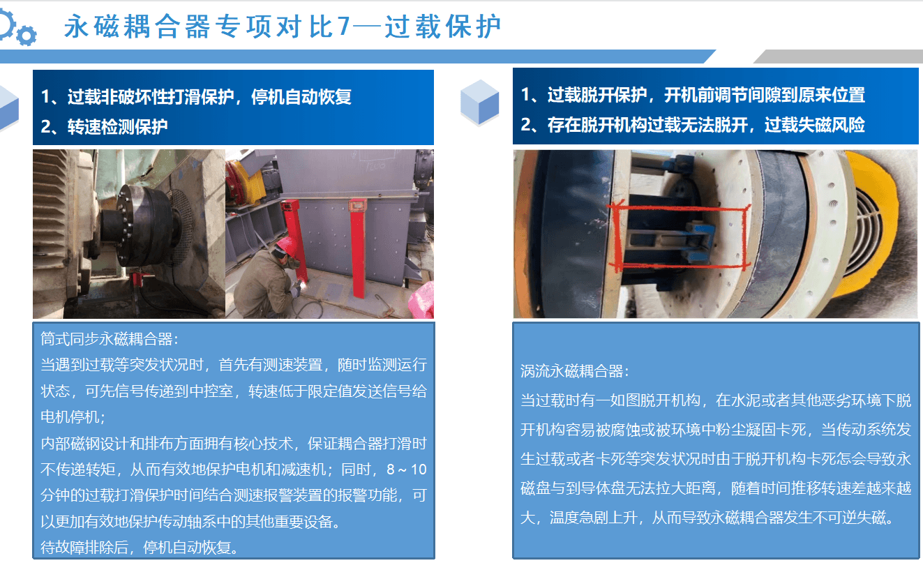 從以上的應用案例來看,同步永磁耦合器的應用效果會比較明顯,接下來,我們通過數據對比的形式,具體分析筒式同步全永磁耦合器與渦流永磁耦合器優劣勢: