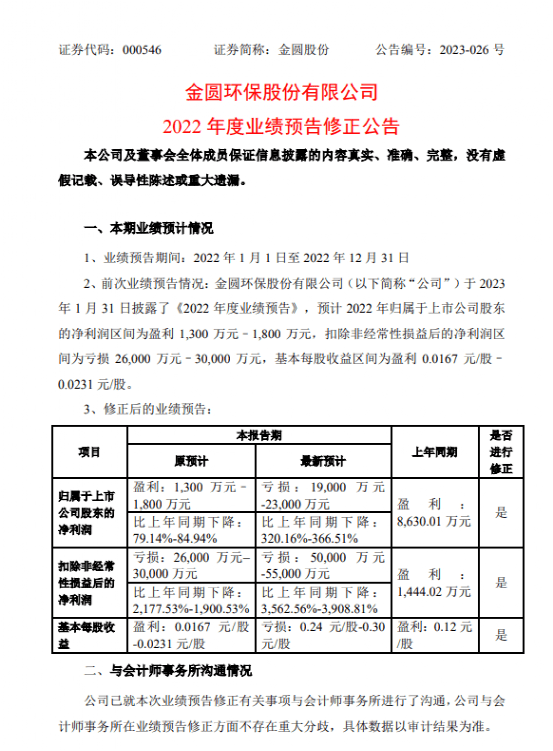 2023年4月16日晚間,金圓股份業績爆雷,預計2022年業績由盈利轉為虧損,預計虧損1.9億元至2.3億元,同比下降320.16%至366.51%??鄯呛筇潛p5億至5.5億元,同比下降3562.56%至3908.81%。