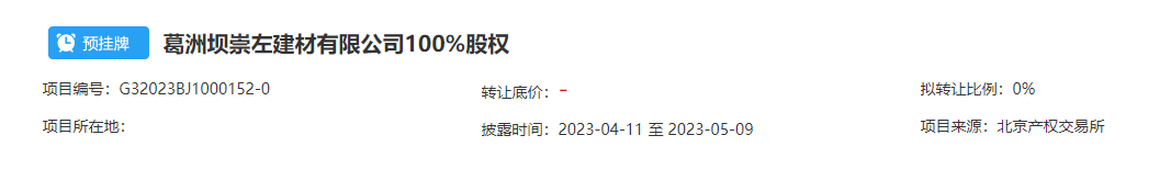 葛洲壩崇左建材有限公司100%股權(quán)擬轉(zhuǎn)讓,負(fù)債總計(jì)27836.07萬元,所有者權(quán)益僅100萬元