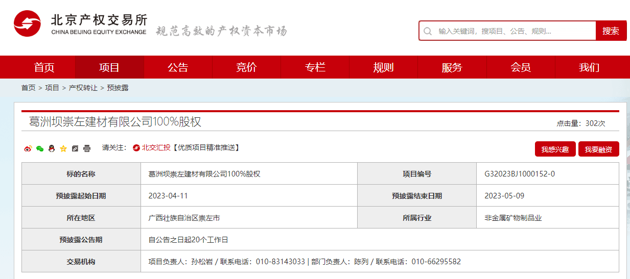 葛洲壩崇左建材有限公司100%股權(quán)預(yù)掛牌,披露結(jié)束日期為2023年5月9日。企業(yè)2023年3月31日財(cái)務(wù)報(bào)表顯示,資產(chǎn)總計(jì)27936.07萬元,負(fù)債總計(jì)27836.07萬元,所有者權(quán)益100萬元。