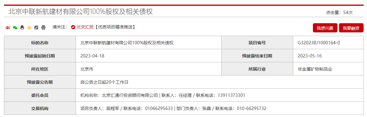 中國聯(lián)合水泥集團(tuán)有限公司旗下北京中聯(lián)新航建材有限公司100%股權(quán)及相關(guān)債權(quán)擬出讓。企業(yè)經(jīng)營范圍為制造混凝土、預(yù)拌砂漿;銷售建筑材料、混凝土添加劑、土砂石、尾礦石、山碎石;技術(shù)開發(fā);技術(shù)咨詢;機(jī)械設(shè)備租賃。