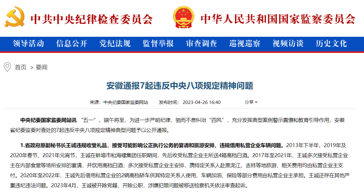 在通過近一年的調(diào)查之后,王誠(chéng)違紀(jì)違法問題被公布于眾,根據(jù)安徽省紀(jì)委監(jiān)委通報(bào)了7起違反中央八項(xiàng)規(guī)定精神問題稱,2013年下半年、2019年及2020年春節(jié)、2021年元宵節(jié),王誠(chéng)在蚌埠市和海螺集團(tuán)任職期間,先后收受私營(yíng)企業(yè)主所送4箱高檔白酒。