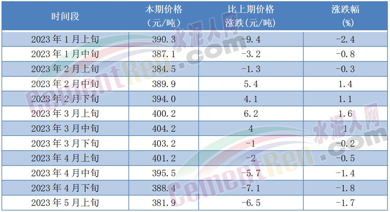 國家統計局最新發布的全國流通領域9大類50種重要生產資料市場價格顯示,2023年5月上旬與4月下旬相比,8種產品價格上漲,42種下降。其中,普通硅酸鹽水泥(P.O 42.5散裝)價格為381.9元/噸,較4月下旬下跌6.5元/噸,跌幅1.7%,為今年初至今的最低點了。