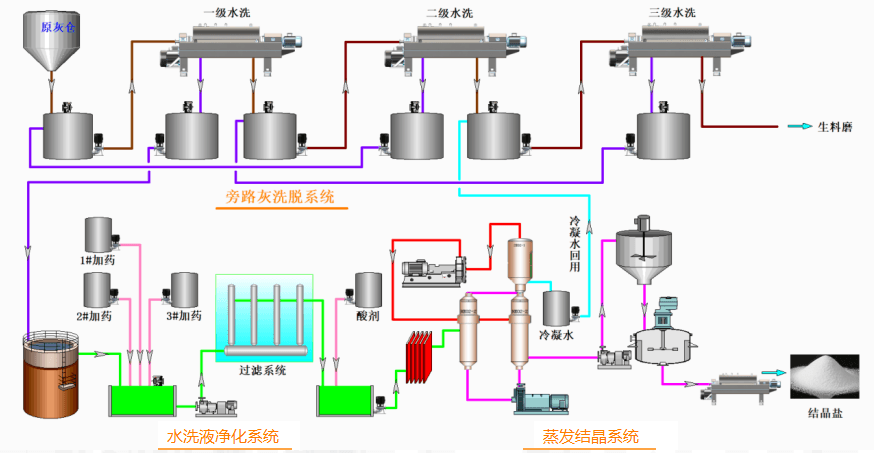 水洗液送入水洗液凈化單元中經軟化、降懸浮物、中和等物理化學處理后,進入蒸發結晶單元。蒸發結晶產出的結晶鹽作為產品外售,蒸發過程的冷凝水全部回用到旁路灰洗脫單元循環利用,零排放。