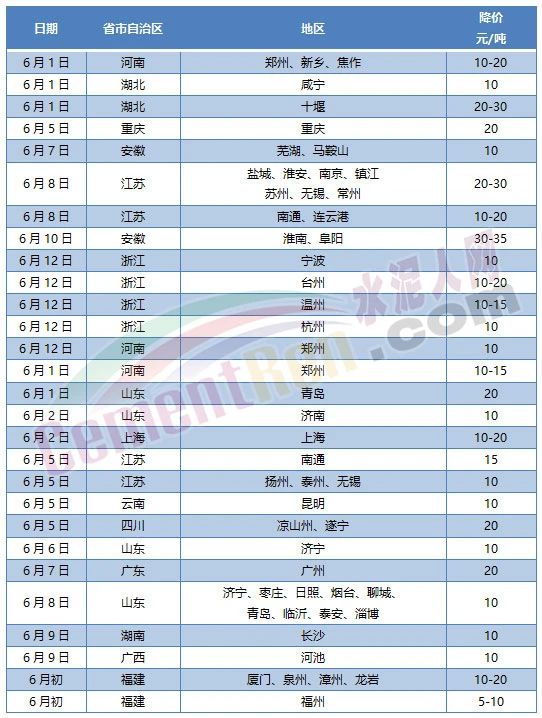 安徽市場的持續(xù)降價對蘇南市場影響較大,為穩(wěn)定市場份額,6月8日南京、鎮(zhèn)江及蘇錫常等地一些主要廠家繼續(xù)下調水泥價格10元/噸左右。
