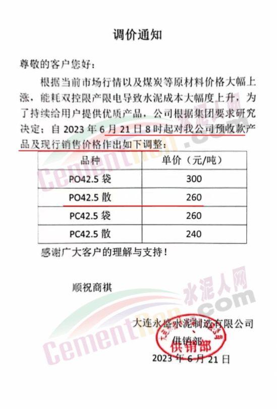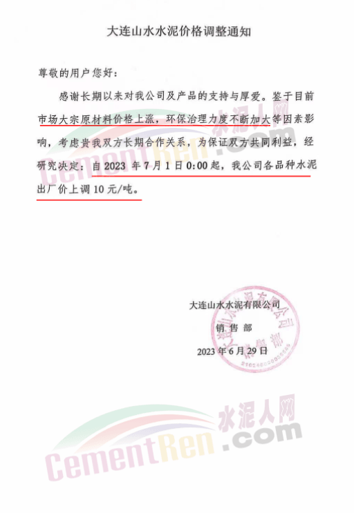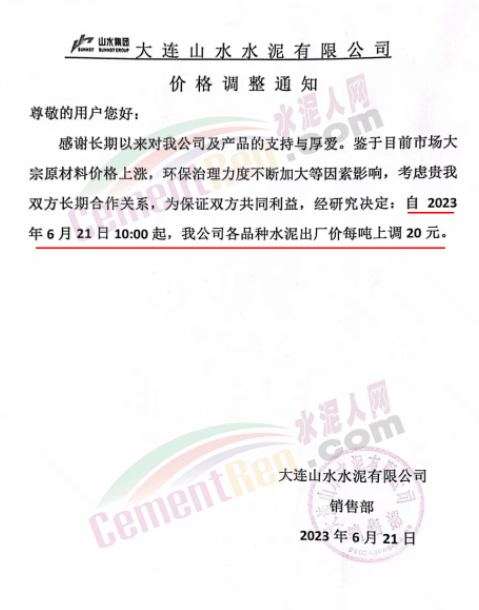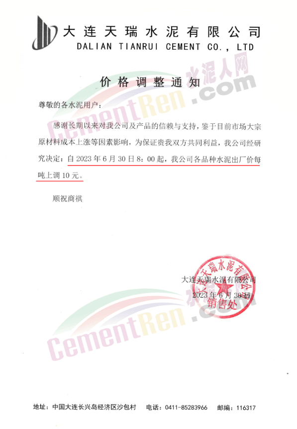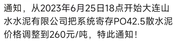 同期,大連天瑞水泥有限公司通知,鑒于目前市場大宗原材料成本上漲等因素影響,公司經研究決定,自2023年6月30日8:00起,公司各品種水泥出廠價上調10元/噸。