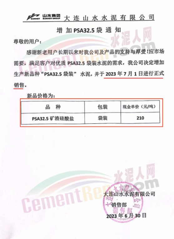 大連山水水泥有限公司6月30日發布的通知,還包括于今日(2023年7月1日是)起推出低標號P.S.A32.5礦渣硅酸鹽袋裝水泥,新品報價210元/噸。