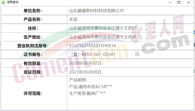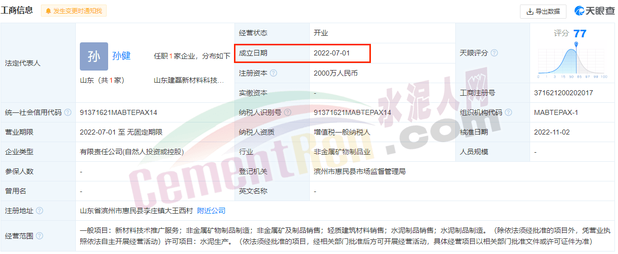 據查詢山東建磊新材料科技有限公司于2022年7月1日成立,截至7月1日剛好成立一年。企業注冊信息顯示,經營范圍為新材料技術推廣服務;非金屬礦物制品制造;非金屬礦及制品銷售;輕質建筑材料銷售;水泥制品銷售;水泥制品制造,許可項目為水泥生產
