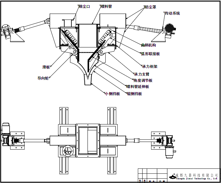 該裝置通過曲柄連桿機構帶動調節流量板沿輥子圓周弧形移動,調節板距離輥面間距一定,不受開閉大小影響,保證在輥子徑向方向對物料的密閉;獨有的輥子端面側擋板采用雙層擋料,防止物料溢散,從而保證擠壓腔內料床的穩定性,提高料床密實度,改善輥壓機擠壓效率!