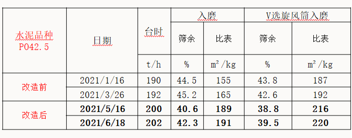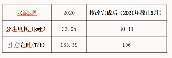 在相同的質量控制指標前提下,輥壓機改造后的聯合粉磨系統產量由223.14t/h提高至235.83t/h,增產幅度12.69%。粉磨電耗由33.88kWh/t降至32.6kWh/t,電耗降低了1.22 kWh/t實現清潔生產;