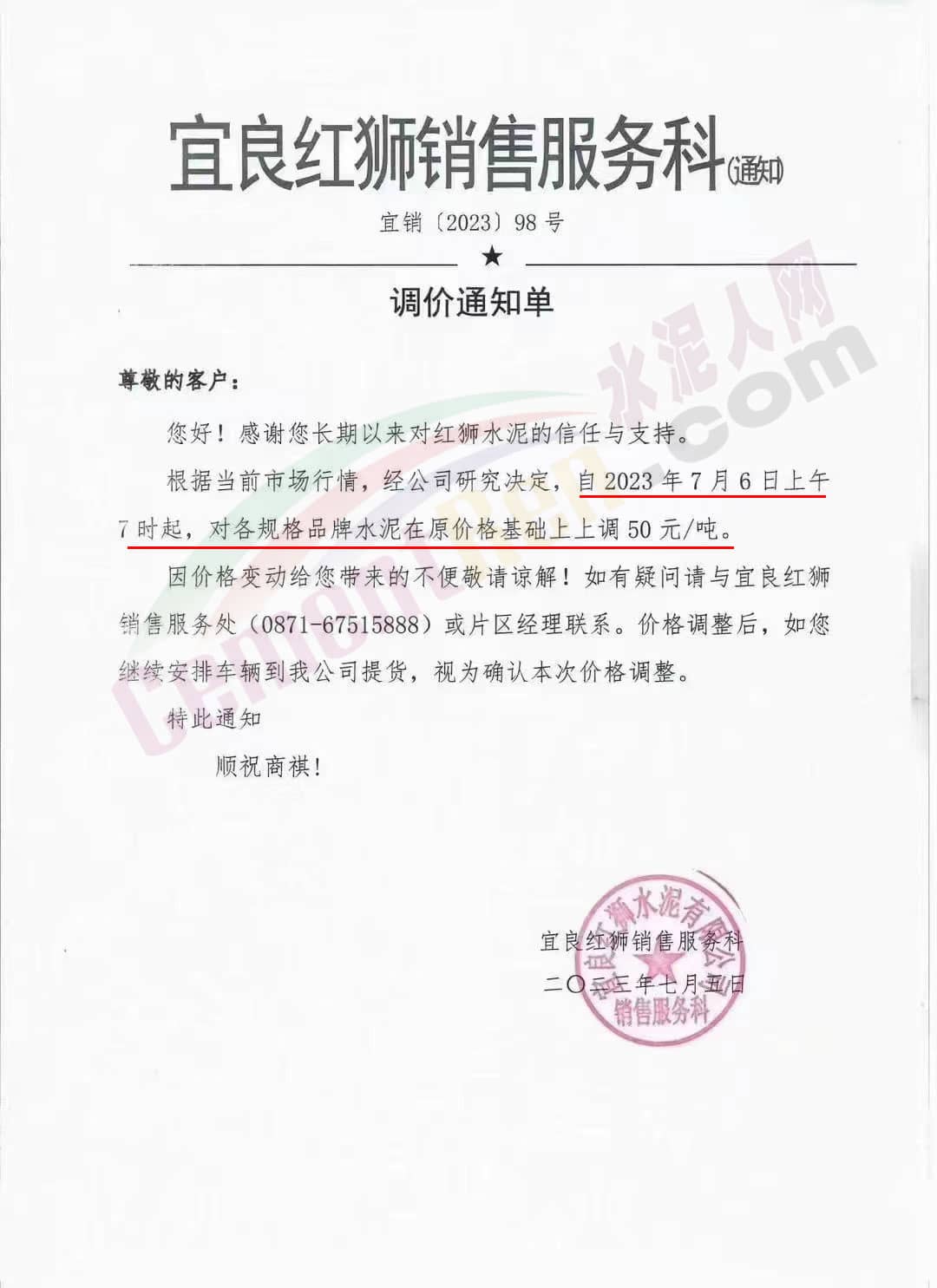 宜良紅獅銷售服務科通知,根據當前市場行情,經公司研究決定,自2023年7月6日上午7時起,對各規格品牌水泥在原價格基礎上上調50元/噸。