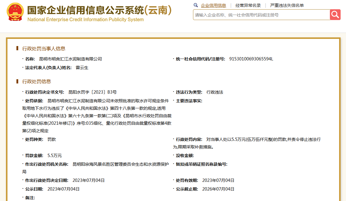 另外,根據(jù)國家企業(yè)信用信息公示系統(tǒng)公開信息顯示,昆明市明良匯江水泥制造有限公司未依照批準(zhǔn)的取水許可規(guī)定條件取用地下水,被昆明陽宗海風(fēng)景名勝區(qū)管理委員會生態(tài)和水資源保護(hù)局處罰。