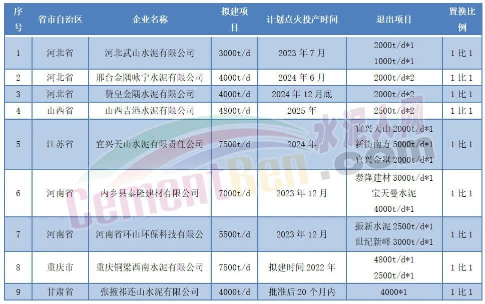 2022年公告的9個水泥熟料項目等量置換,多個項目緩建或撤銷