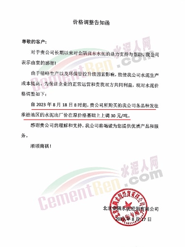 北京金隅水泥經貿有限公司通知稱,由于錯峰生產以及環保管控升級因素影響,致使公司水泥生產成本提高。為保證企業的正常運營,自2023年8月18日8時公司各品種發往承德地區的水泥出廠價在原價格基礎上上調30元/噸。