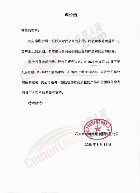 武安市新峰水泥有限責任公司通知稱,自2023年8月12日下午3點開始,P.O42.5散裝水泥出廠價格上調30元/噸。