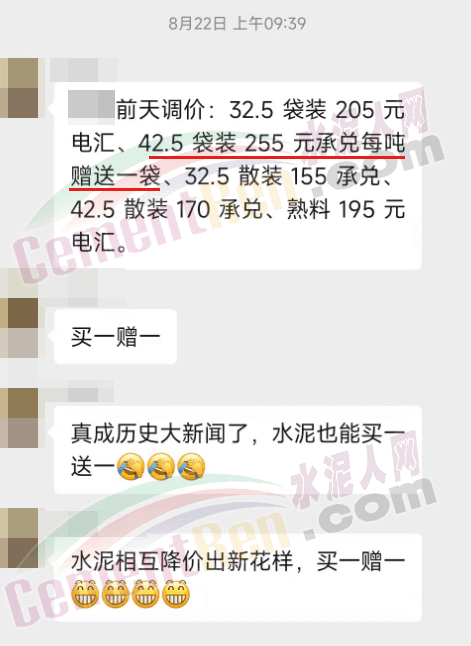 近來各區域水泥價格呈持續下滑態勢,流通領域水泥報價已跌至200元/噸以下,遼寧某企業P.O42.5散裝水泥承兌報價低至170元/噸,現金價160元/噸左右,且公開表示“買一噸送一包”。這個報價距離2015年的市場最低價140元/噸,僅差一份降價通知。