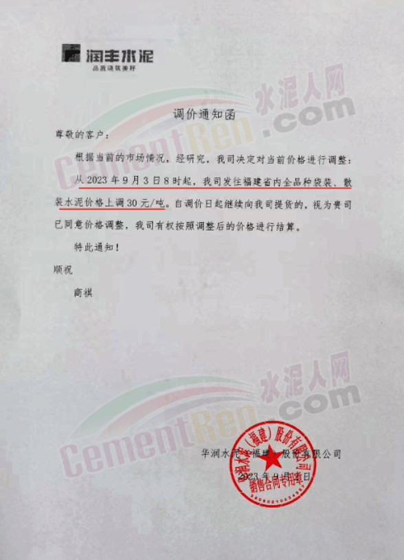 華潤水泥(福建)股份有限公司通知,根據當前的市場情況,經研究,決定對當前價格進行調整。從2023年9月3日8時起,公司發往福建省內全品種袋裝、散裝水泥價格上調30元/噸。