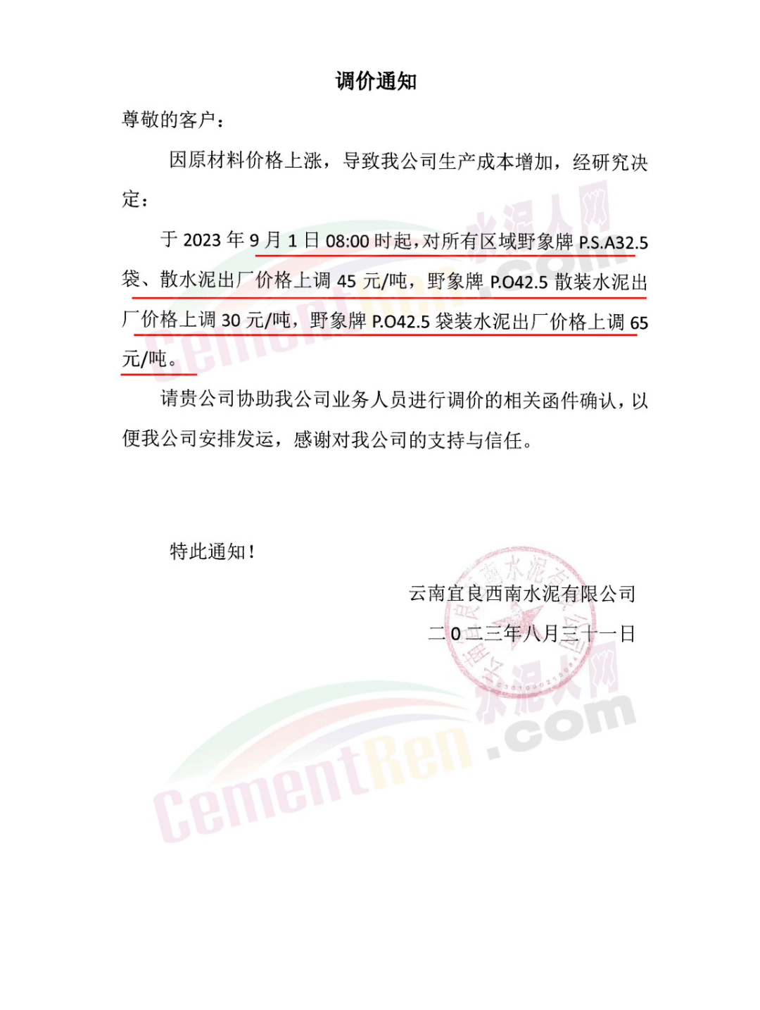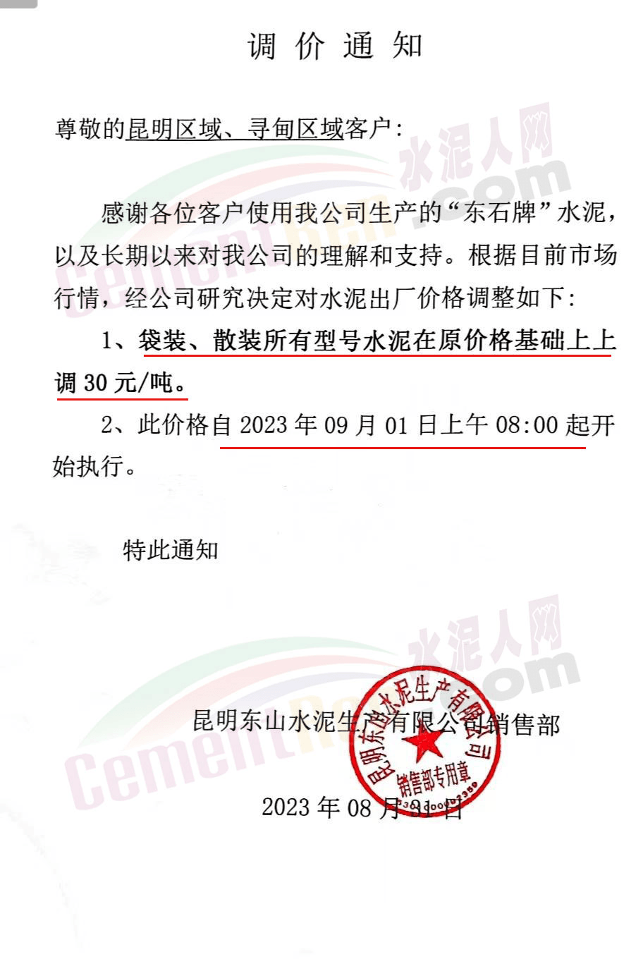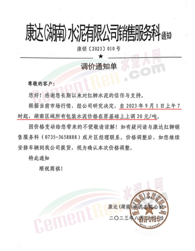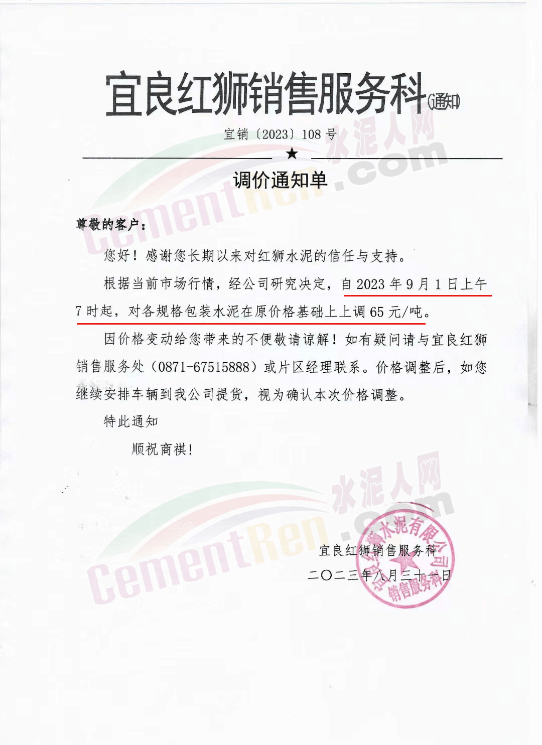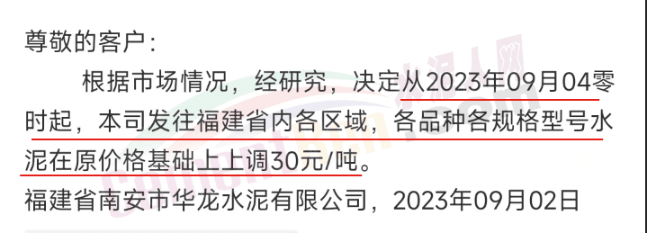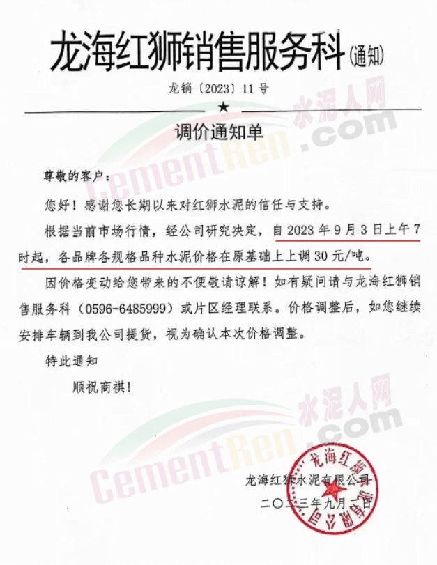 龍海紅獅、大田紅獅銷售服務科通知,根據當前市場行情,經公司研究決定,自2023年9月3日上午7時起,各品牌各規格品種水泥價格在原基礎上上調30元/噸。