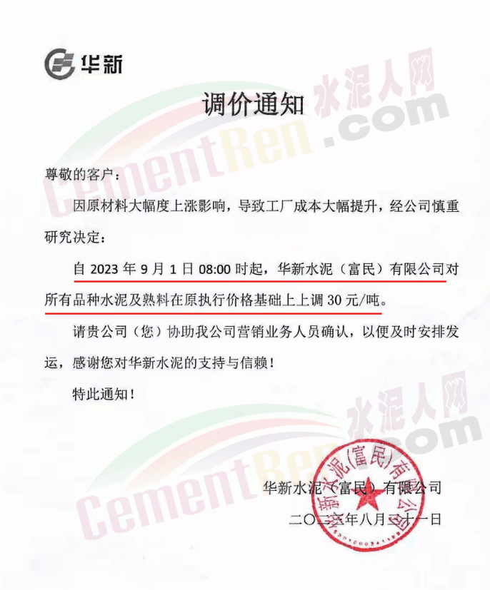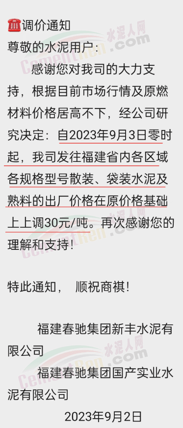福建春馳集團新豐水泥有限公司 福建春馳集團國產實業水泥有限公司通知,根據目前市場行情及原燃材料價格居高不下,經公司研究決定:自2023年9月3日0時起,公司發往福建省內各區域各規格型號散裝、袋裝水泥及熟料的出廠價格在原價格基礎上上調30元/噸。
