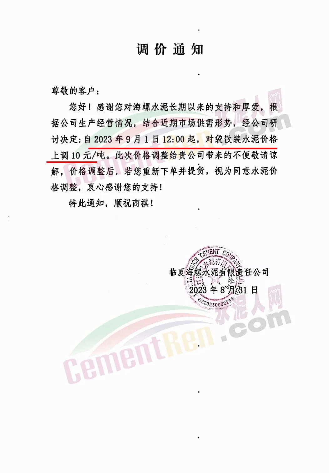 福建省南安市華龍水泥有限公司通知,根據市場情況,經研究決定從2023年9月4日零時起,發往福建省內各區域、各品種各規格型號水泥在原價格基礎上上調30元/噸。