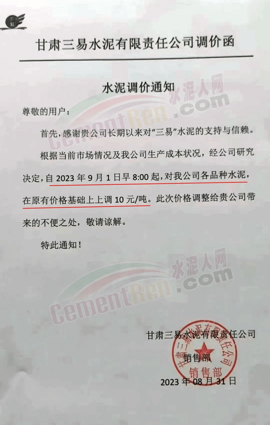 甘肅區域臨夏海螺水泥、甘肅京蘭水泥、三易水泥、中材甘肅水泥以及祁連山水泥天水公司、蘭州公司等主要品牌企業通知上調水泥價格10元/噸。