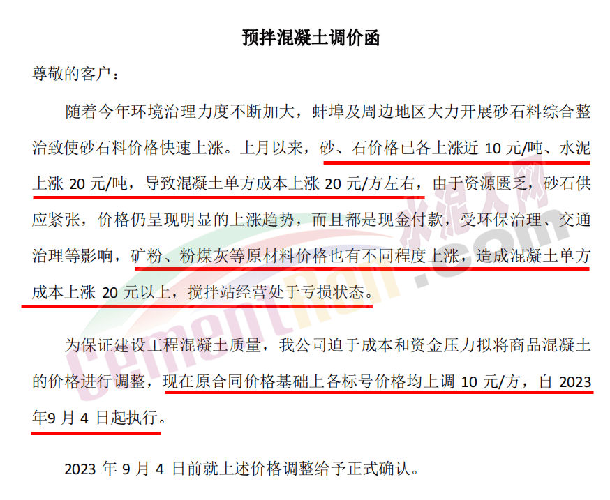 為保證建設(shè)工程混凝土質(zhì)量,公司迫于成本和資金壓力擬將商品混凝土的價格進行調(diào)整,自2023年9月4日起在原合同價格基礎(chǔ)上各標號價格上調(diào)10元/方。