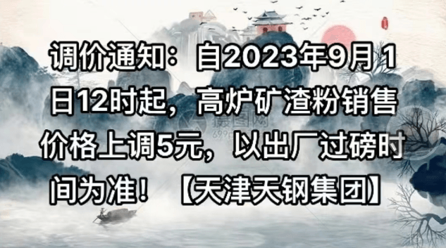 天津天鋼集團于9月1日和9月3日兩次通知上調(diào)高爐礦渣粉銷售價格,累計上調(diào)10元/噸,上調(diào)后S95散裝報價115元/噸。