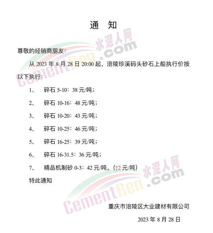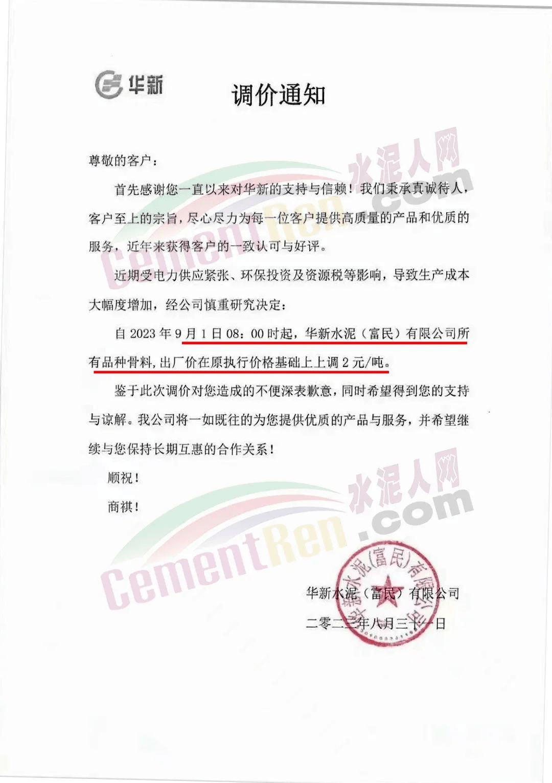 華新水泥(富民)有限公司通知稱,受電力供應緊張、環(huán)保投資及資源稅等影響,導致生產(chǎn)成本大幅度增加,經(jīng)公司慎重研究決定:自2023年9月1日8時起,公司所有品種骨料出廠價在原執(zhí)行價格基礎(chǔ)上上調(diào)2元/噸。