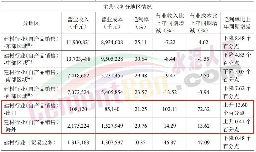 值得一提的是,在國內各區域毛利率均有所下滑的背景下,海螺水泥出口及海外業務毛利率實現逆勢增長,其中出口營收同比增長102.11%,建材行業海外營收增長14.29%,毛利率分別同比增長13.6%和0.41%。