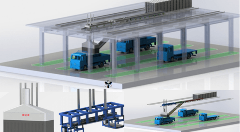 該系統(tǒng)涉及水泥行業(yè)中袋裝水泥智能裝車環(huán)節(jié),是適應(yīng)市場需要的新產(chǎn)品,水泥從包裝機(jī)后端的輸送帶運(yùn)出來,通過該系統(tǒng)自動(dòng)裝車,全程不需人工介入。