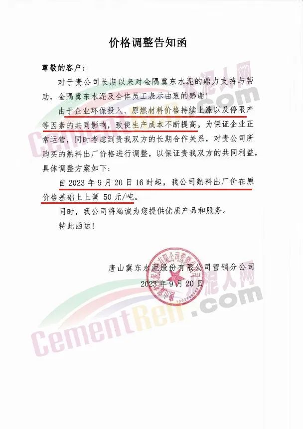唐山冀東水泥股份有限公司營銷分公司通知,由于企業(yè)環(huán)保投入、原燃材料價格持續(xù)上漲以及停限產(chǎn)等因素的共同影響,致使生產(chǎn)成本不斷提高。為保證企業(yè)正常運營,自2023年9月20日16時起,熟料出廠價在原價格基礎(chǔ)上上調(diào)50元/噸。