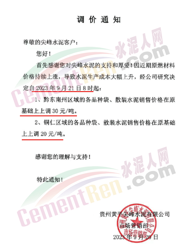 貴州黃平尖峰水泥通知,因近期原燃材料價格持續(xù)上漲,導致水泥生產(chǎn)成本大幅上升,經(jīng)公司研究決定自2023年9月21日8時起,黔東南州區(qū)域的各品種袋、散裝水泥銷售價格在原基礎(chǔ)上上調(diào)30元/噸。銅仁區(qū)域的各品種袋、散裝水泥銷售價格在原基礎(chǔ)上上調(diào)20元/噸。