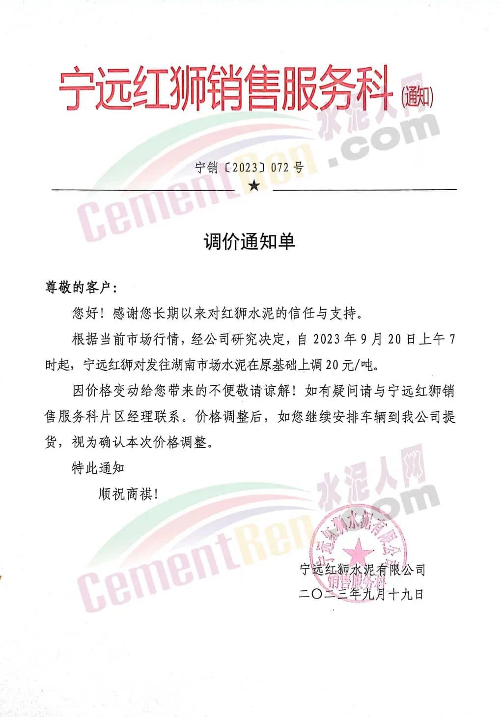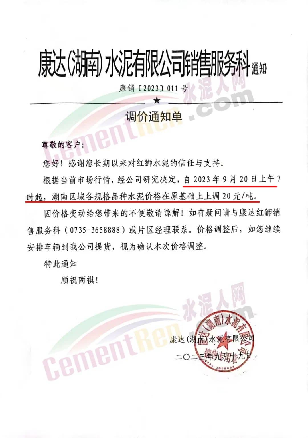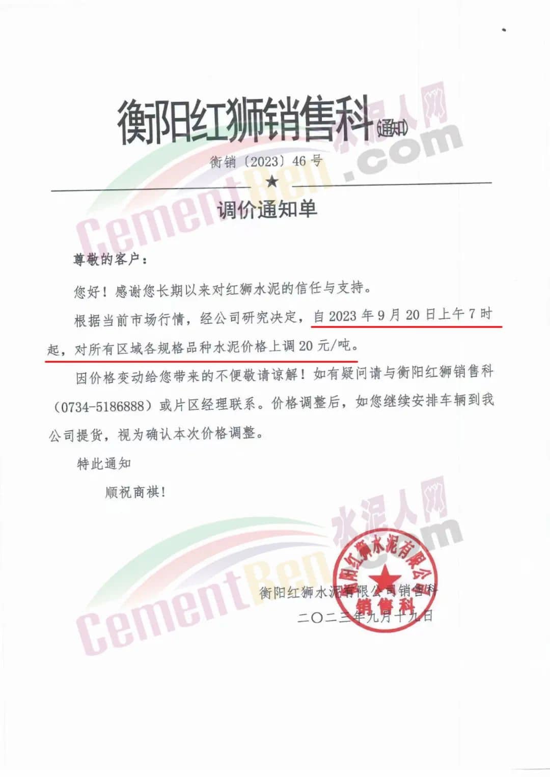 紅獅水泥旗下永州紅獅、寧遠紅獅、衡陽紅獅、永州蓮花水泥、康達(湖南)水泥等多家企業(yè)通知,根據(jù)當前市場行情,經(jīng)公司研究決定,自2023年9月20日上午7時起各規(guī)格水泥價格在原基礎(chǔ)上上調(diào)20元/噸。